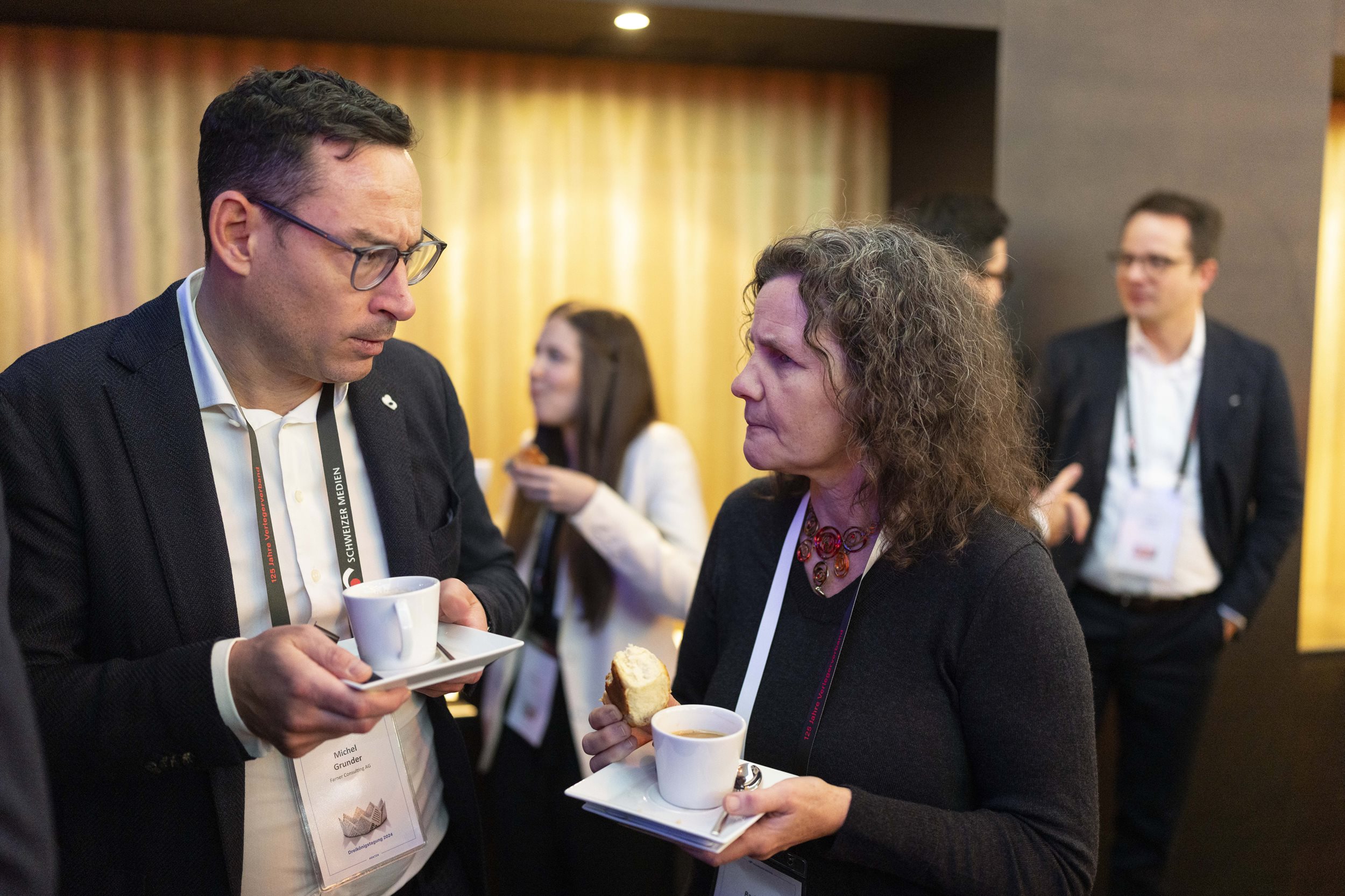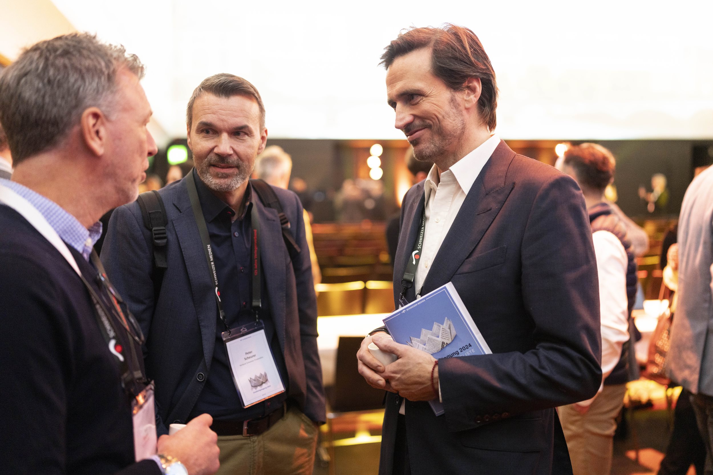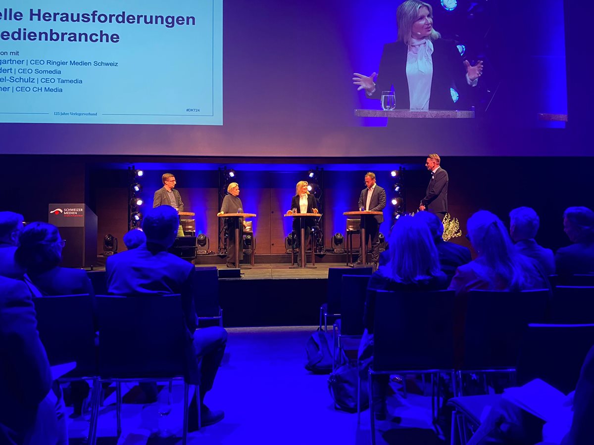 Moderator Oliver Steffen von Tele Züri begleitete zum ersten Mal durch den Anlass und moderierte auch die traditionelle Paneldiskussion nach der Kaffeepause &ndash, in diesem Jahr mit vier CEOs von Schweizer Medienunternehmen. Ladina Heimgartner (Ringier), Thomas Kundert (Somedia), Jessica Peppel-Schulz (Tamedia) und Michael Wanner (CH Media) sind sich einig: Die digitale Transformation erfordert hohe Investitionen, weswegen Sparübungen aktuell kaum zu umgehen sind. Gerade das Aufkommen von KI bringe neben Chancen vor allem auch Gefahren mit sich, «,auch in den Regionen, nicht nur bei den ganz grossen Playern»,, ist sich Kundert sicher.